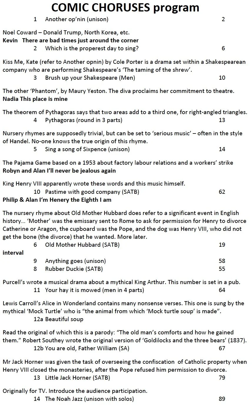 2018, Comic choruses The popular Comic Songs (2017) was followed by Comic Choruses, presented by a small choir.SHOW PROGRAM Oratorios, 2010'sIan Lowe18 January 2021 Facebook0 0 Likes